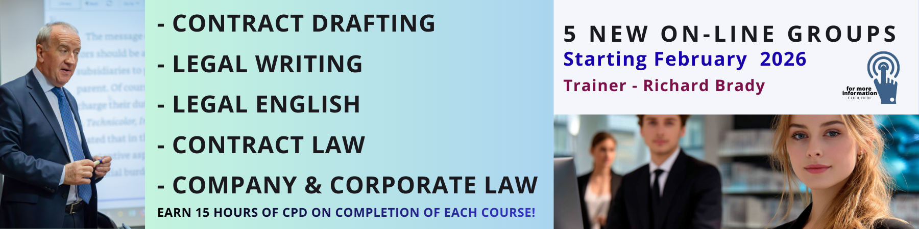 "Dear Richard, I want to say a huge thank you and I really enjoyed the Contract drafting course. I want to compliment you on your clear and informative style of teaching and world wide examples."
